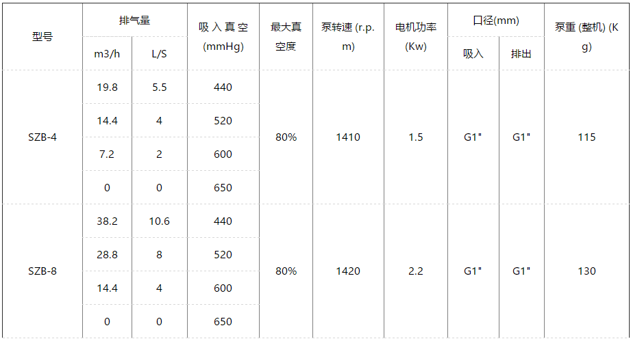 目前制造的本型號(hào)泵有:SZB—4、SZB-8。其中4(8)表示當(dāng)水銀柱高為520毫米時(shí)的氣量(升/秒)。