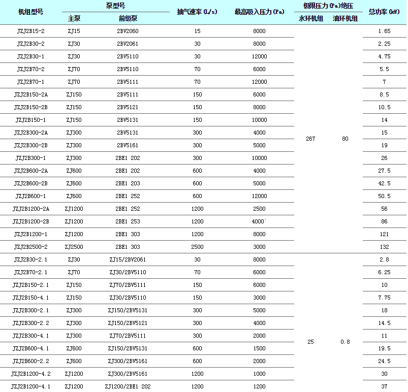 說明: 1. 以上表格為推薦標(biāo)準(zhǔn)系列,因在實際生產(chǎn)應(yīng)用中工作條件的不同,吸入氣體及壓力會發(fā)生很多變化,所以在選型時應(yīng)根據(jù)實際抽氣過程、氣體釋放過程、可凝性氣體冷凝情況、吸入壓力的時間變化等等進(jìn)行校核計算或參照現(xiàn)有設(shè)備使用情況選型。 2. 單泵的技術(shù)指標(biāo)詳見各泵參數(shù)表。 3. 最高吸入壓力是指主泵能夠啟動的最高壓力,如在高于該壓力下長時間運行,會造成主泵過載。 4. 如真空泵電機(jī)、電接點真空表、電控柜需防爆,請在訂貨時注明,上表中的2BV2系列相應(yīng)改為2BV2-Ex系列,2BV5系列相應(yīng)改為2BV6系列。