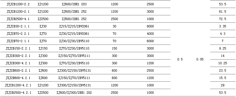 JZJ2B系列羅茨水環(huán)機(jī)組是由ZJ型羅茨泵作為主抽泵,2BV/2BE1系列水環(huán)泵或羅茨--水環(huán)機(jī)組作為前級泵組成的抽氣機(jī)組。它除了可以用來抽除一般氣體外,還可以抽吸含有水分、有機(jī)溶劑或少量灰塵的氣體。與一般機(jī)械真空泵相比,不怕油污染,不怕水氣及微塵,而與一般的水環(huán)式真空泵相比,具有真空度高以及在高真空度工況下抽速大的特點。 由于采用了高效節(jié)能的2BV系列水環(huán)泵用為前級泵,所以JZJ2B系列真空機(jī)組比JZJ2S系列具有效率高、結(jié)構(gòu)緊湊、無泄漏(2BV泵為機(jī)械密封設(shè)計,不同于2SK系列的盤根密封)、耐腐蝕(2BV采用不銹鋼或鋁青銅葉輪)、防護(hù)等級高等優(yōu)點。 羅茨真空泵采用了本公司自行研發(fā)的ZJ系列羅茨真空泵,我公司將泵腔與軸承腔的密封進(jìn)行改進(jìn)后的ZJ系列羅茨真空泵在抽除大量水蒸汽及各類溶劑的工藝中泵油不易乳化。 羅茨水環(huán)真空機(jī)組的前級泵的工作液多采用水,也可采用有機(jī)溶劑(可用甲醇、乙醇、二甲苯、丙酮等有機(jī)溶劑)或其它液體,將前級泵作為閉路循環(huán)系統(tǒng)使用,大大減小了對環(huán)境的污染,同時大大提高了對有機(jī)溶劑的回收。其極限真空度由工作液的飽和蒸汽壓決定。 羅茨機(jī)組選型注意事項: 了解被抽氣體成分,氣體中含不含可凝蒸氣,有無顆粒灰塵,有無腐蝕性等。選擇真空泵時,需要知道氣體成分,針對被抽氣體選擇相應(yīng)的泵。如果氣體中含有蒸氣、顆粒、及腐蝕性氣體,應(yīng)該考慮在泵的進(jìn)氣口管路上安裝輔助設(shè)備,如冷凝器、除塵器等。 羅茨真空機(jī)組的工作壓力應(yīng)該滿足真空設(shè)備的極限真空及工作壓力要求。如:某真空干燥工藝要求10mmHg(絕壓)的工作壓力,選用的真空泵的極限壓力至少要2mmHg,最好能低于1mmHg。通常選擇泵的極限壓力要高于真空設(shè)備工作壓力半個到一個數(shù)量級。 正確地選擇羅茨真空機(jī)組的工作點。羅茨真空機(jī)組的正常工作范圍為最高吸入壓力~極限壓力×5。例:JZJ2B150-2.1羅茨水環(huán)真空機(jī)組的正常工作范圍為:6000Pa~125Pa,該工作范圍為主泵開啟后的正常工作壓力范圍,該機(jī)組在此工作范圍之內(nèi)效率最佳。 真空機(jī)組在其工作壓力下,應(yīng)能排走真空設(shè)備工藝過程中產(chǎn)生的全部氣體量。 根據(jù)實際工況條件選用合適的機(jī)組配置。例如:JZJ2B300-4.1機(jī)組及JZJ2B300-2.1機(jī)組的最大抽氣速率及極限壓力都是相同的,所不同的是它們的工作范圍及消耗的功率不同,JZJ2B300-4.1機(jī)組的正常工作范圍為2000Pa~125Pa,而JZJ2B300-2.1機(jī)組的正常工作范圍為5000Pa~125Pa。很明顯JZJ2B300-2.1機(jī)組的工作范圍更寬,但其所消耗的功率也更大。如果能確認(rèn)被抽系統(tǒng)的工作壓力<2000Pa時,應(yīng)優(yōu)先選用JZJ2B300-4.1機(jī)組以節(jié)約能源。但如要求機(jī)組對系統(tǒng)有較強(qiáng)的預(yù)抽能力且機(jī)組需較長時間地工作在較高壓力時,則選用具有更大的前級泵的JZJ2B300-2.1機(jī)組更為適宜。 型號表示方法: 如:J Z J 2 B 1 5 0 - 2 . 1 J代表機(jī)組的第一個字母 ZJ代表主泵為ZJ系列羅茨真空泵 2B代表前級泵為2BV/2BE系列水(液)環(huán)真空泵 (2S代表前級泵為2SK系列水(液)環(huán)真空泵) 150為主泵(羅茨泵)抽速 L/s 2.1為抽速配比代號 (即主泵與二級泵抽速比為2,二級泵與前級泵抽速比為1)JZJ2B系列羅茨-水環(huán)真空機(jī)組技術(shù)規(guī)格: